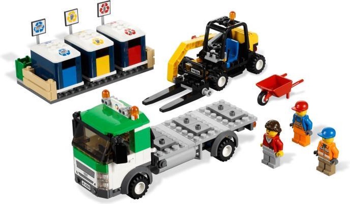 De inwoners van lego City scheiden hun afval! Gooi het in de gekleurde containers, takel de containers op de vrachtwagen...